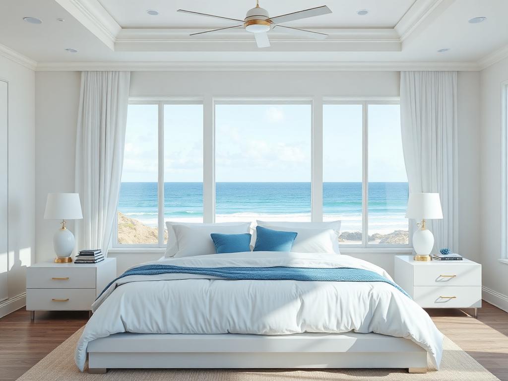 Queen-size bed with ocean view. Ceiling fan and AC controls on the wall. Reading lamps on each side. Extra blankets in the closet.