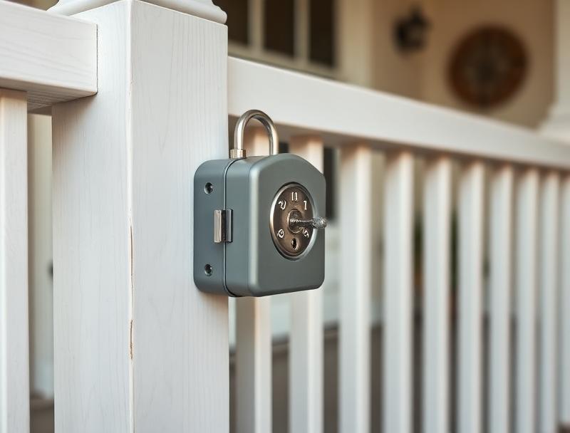 The lockbox is located on the left side of the front door, attached to the porch railing. It's a gray combination box with a black dial.